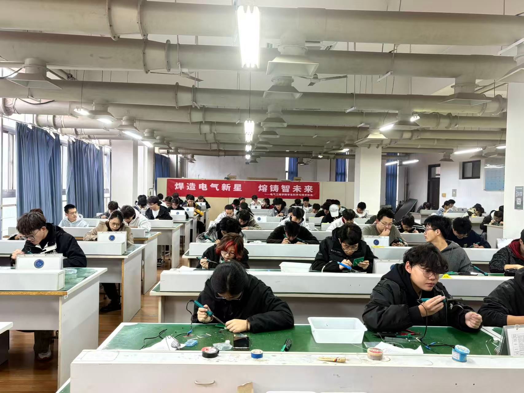 大赛筹备阶段,学院学生科学与技术协会精心组织赛前培训:技培部部长付昊为参赛同学系统讲解焊接基础理论与实操规范,课题组部长荆一轩则聚焦焊接核心要点与元件应用知识展开细致辅导,为比赛的顺利开展筑牢基础。随后,大赛在紧张有序的氛围中正式启动,选手们迅速投入状态,专注操控焊枪,在电路板上精准施焊,每一道焊缝都凝聚着专注与严谨。